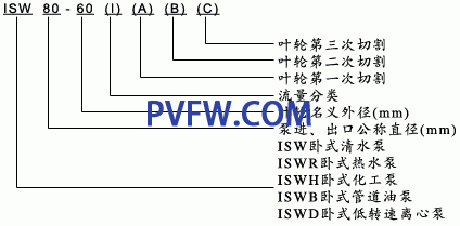型号意义:例如:ISW40-125(I)AB;ISW-卧式离心泵;40-泵进、出口直径(mm);125-叶轮名义直径(mm);I-流量分类;AB-叶轮经第一、二次切割;